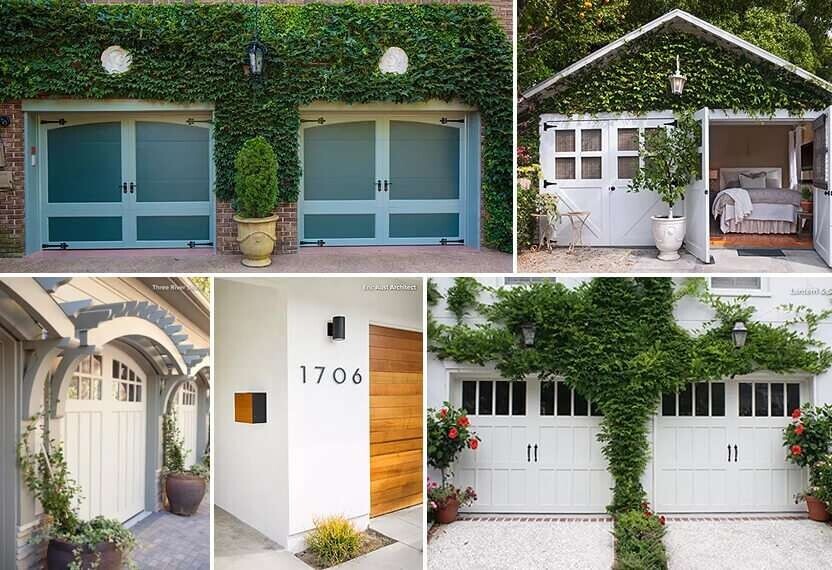 Vines are a great solution for adding green to garages with limited planting space. The container with the evergreen (below, left) also homes the vine plant. Clever! Try: Boston Ivy, Bougainvillea, climbing Fig, Clematis, Jasmine