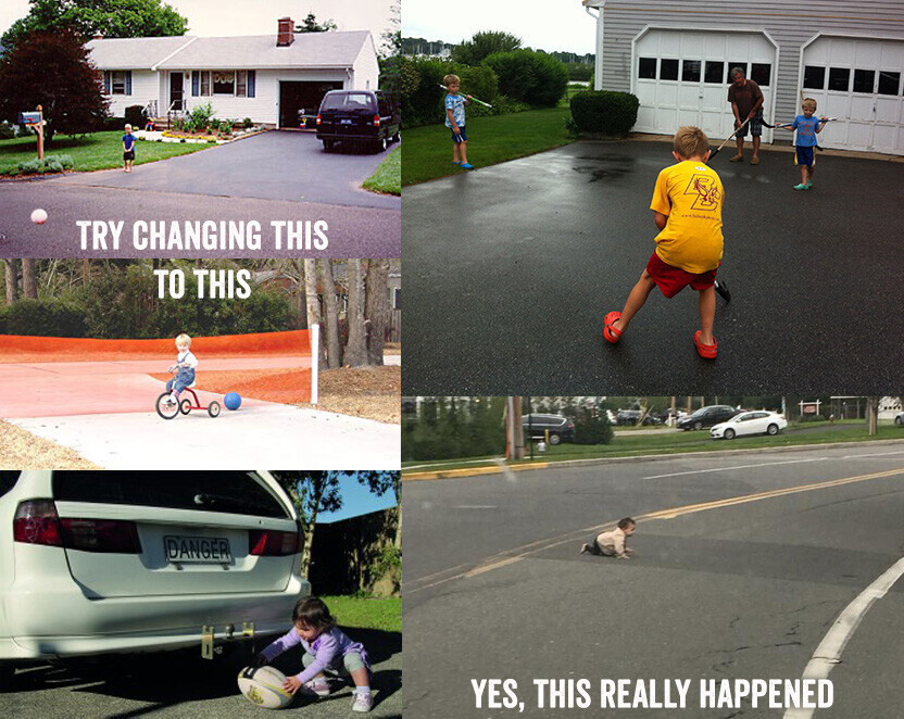 Below, right: Driveway sports can be a great option, but ONLY with supervision.
