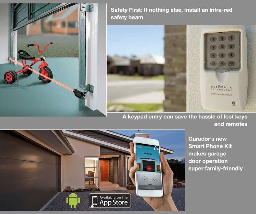 Number one for garage door safety considerations, an infra-red safety beam signals the door opener when anything moves in its path. This means that if your child or pet runs under the door while it is closing, the door will stop and reverse before making contact. Safety infra-red beams can be fitted to all Garador openers as an optional extra.