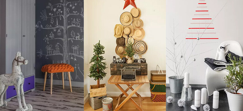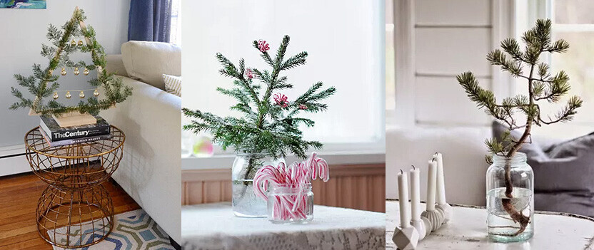 We’re talking tree size here. Try using only the top portion of an artificial tree • Purchase a small living tree in a pot - take it outside after Christmas and it will live to freshen your home with the scent of pine for years to come • A skinny tree can fit into a small corner • A half circle tree with a flat back can be positioned against a wall • Use a tiny tree brach in a lovely pot or vase and position it on a sideboard or table • Think outside the house - maybe there’s a tree outside your window that could be decorated with lights to shine inside?