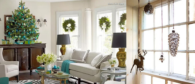 Spread the joy of Christmas with wreaths and decorations hung over windows for all the world to see. Use simple string, fishing line, or colourful ribbon and removable hooks for hanging. Matching decorations for each window look really stylish.
