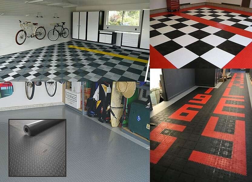 Colourful tiles that click together for stability, rather than being adhered to the floor. Made from heavy-duty vinyl or rubber, they are great for hiding cracks in a concrete floor, though will work best when the floor is level. You can combine colours to create patterns and borders. This is a great DIY option.