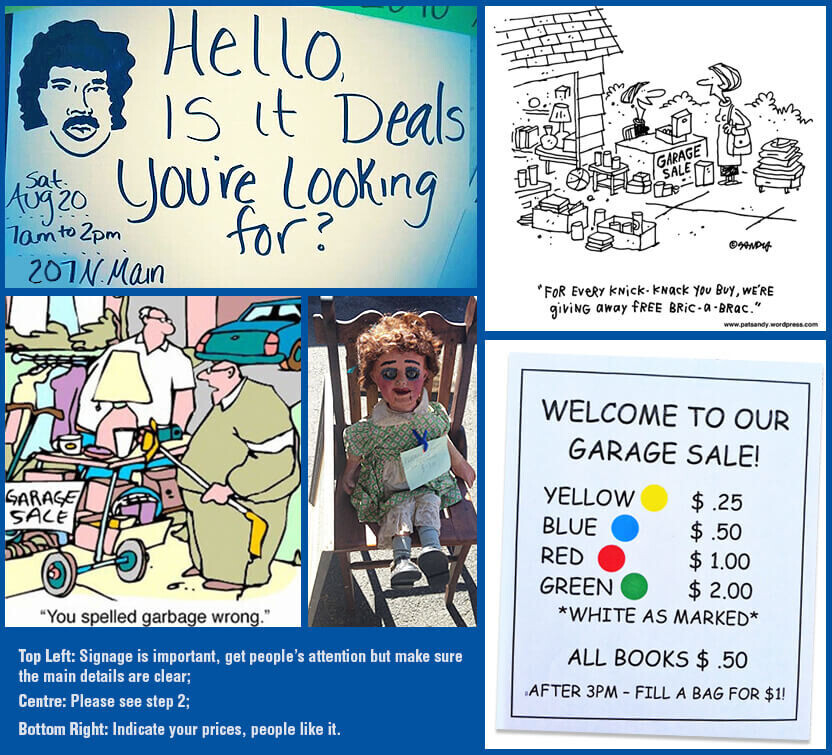 Make plenty of CLEAR signage with the date, address and time displayed. Consider where the sign will go - can someone driving by read it? If you add details, make it simple: COUCH • BED • BIKES • CHEAP - all must go