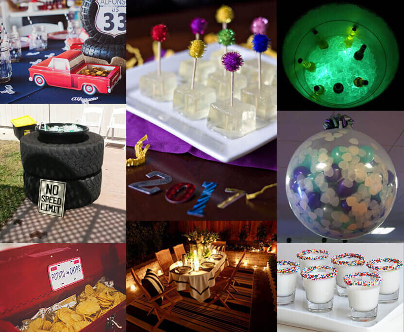 Clockwise from top left: Novel snack vessels suit a garage party; champagne jelly shots looking seriously classy; BEST idea ever: GLOW sticks in the booze barrel; confetti-filled balloon to pop at midnight; milk shots for the kids make them feel special; outdoor table inspiration; tools for fuel; more novel use of things you just might have lying around…