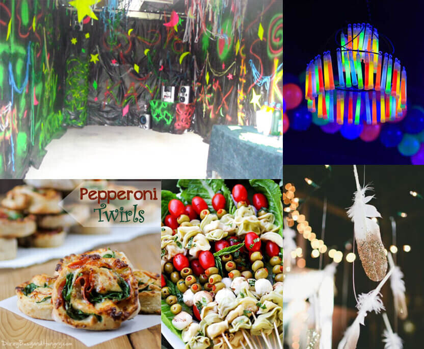 Clockwise from top left: Polythene bags, some spray paint and a black light are all the tools you need to build a dance floor; glow stick chandeliers: short-lived but mighty effective; glitter-dipped feathers for a bit of glitz; easy, filling food idea: Tortellini Skewers will feed a crowd; sheets of pastry + salami + cheese + pesto + spinach = Pepperoni Twirls for the win!