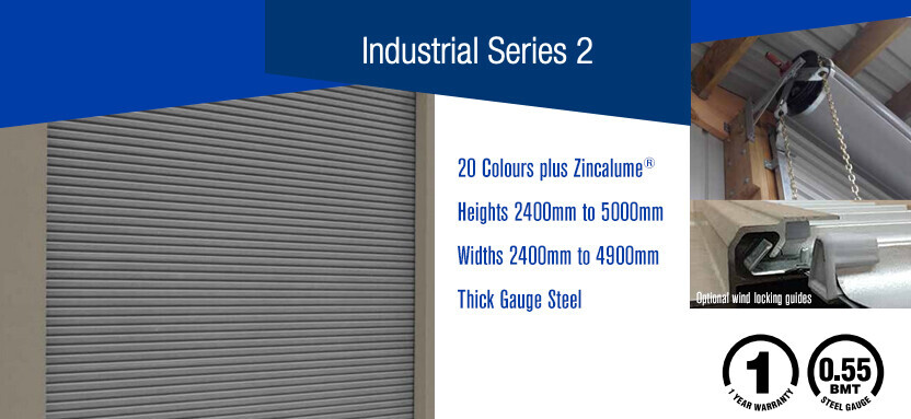 Industrial Roll-A-Door Series 2 • Available in a number of configurations to suit sizes from 2400mm to 5000mm in height and 2400mm to 4900mm door widths • Sizes up to 5000mm high x 4900mm wide for non-windlocked configurations • Weather resistant and low maintenance • Available in 20 colours plus Zincalume® • Smooth, quiet, easy to operate • Manufactured to a durable, time-tested design • Push button operation via our heavy-duty GDO-10 Opener (optional)