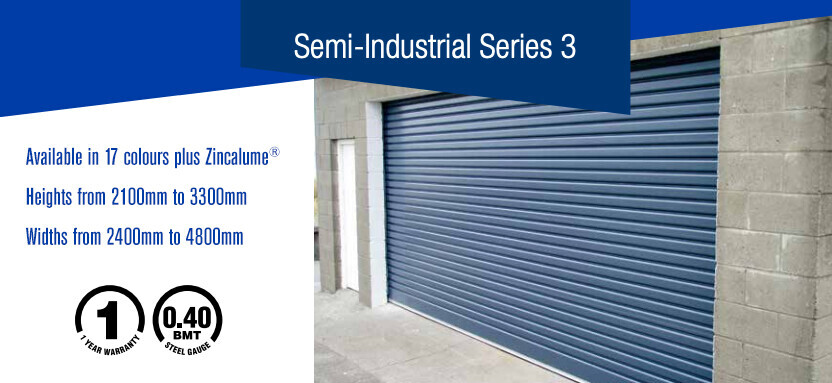 Semi-Industrial Roll-A-Door Series 3 • Lightweight, easy operation •Perfect for tight headroom situations or where maximum opening height is important. • Available in a number of configurations to suit sizes from 2100mm to 3300mm in height and door 2400mm to 4800mm widths. • Available in 17 colours plus Zincalume® • Smooth, quiet, easy to operate • Springs safely concealed • Manufactured to a durable, time-tested design • Manual or remote control operation available