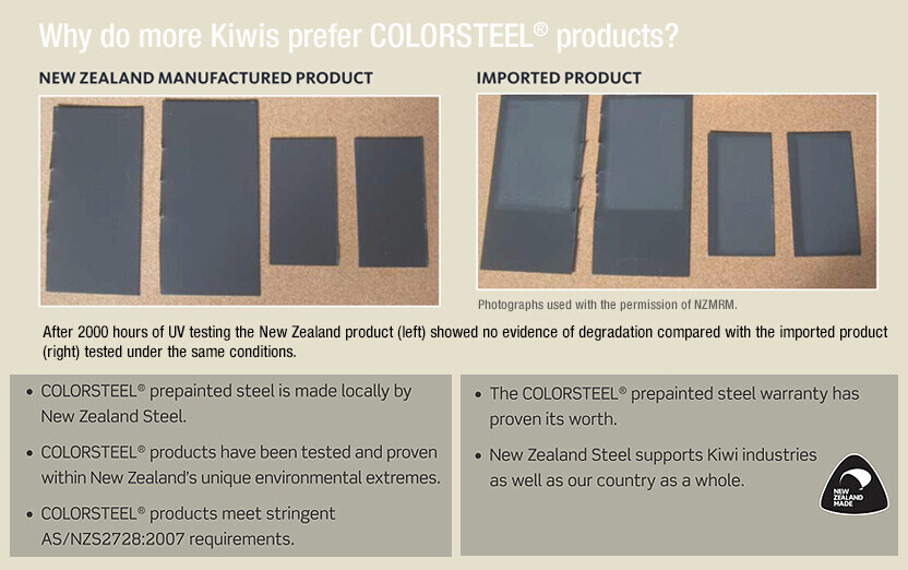 Locally-made goes right to the core of our garage doors, with NZ Colorsteel® providing strength and longevity that has proven superiority over some imported products. Formulated to withstand the harsh environmental conditions in New Zealand, pre-painted Colorsteel® provides excellent colour performance and scratch resistance. The colour range available makes matching to your home a breeze. Not only that, check out the fade resistance test below!
